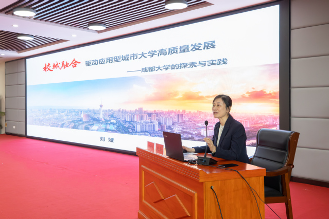 学习会上,刘娅以《校城融合驱动应用型城市大学高质量发展——成都大学的探索与实践》为题,就成都大学“校城融合”的实践探索进行了详细的介绍,从理论高度和实践深度,生动描绘了一幅高校与城市同频共振、共生共荣的画卷,为学校推动校城融合提供了实践路径,融入武汉城市发展提供了学习范本。