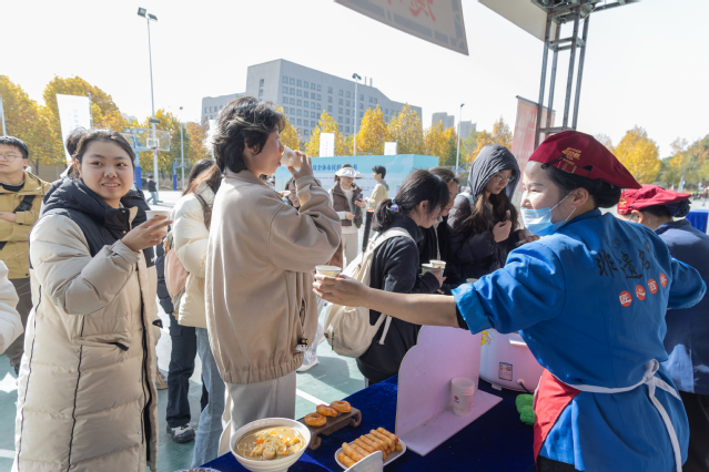 活动当天,我校7个食堂的展台人气高涨。食堂师傅们精心准备的桂花米酒汤圆、冰糖葫芦、烤串等食品吸引师生驻足。另一边的非遗文化展区,学生们也排起长队,在扬子江食品、扬子江乳业、德华楼、小桃园鸡汤、老谦记豆丝和熊太婆原汤水饺的展台前,争相品尝极具汉味特色的美食。老谦记传统豆丝制作技艺第三代传承人沈祖学准备了600份豆丝,全部被免费领取。“豆丝制作技艺传承至今已有百余年历史,去年获评省级非遗项目”,沈祖学介绍。来自湖北荆州的大一新生梅轶秋开心地说:“文明餐桌进校园宣传活动将美食市集搬进校园,让外地大学生就近体验到原汁原味的武汉美食文化。”