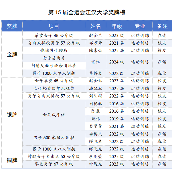 从赛场的科学指导到学业的全面保障,江汉大学体育学院始终坚持“体教融合”的发展路径,将竞技体育的拼搏精神与高等教育的育人使命紧密结合。这份优异的成绩单,不仅是运动员们刻苦训练的成果,更是学院多年来深化体教融合、完善人才培养体系的生动体现。